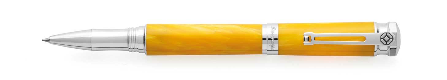 Emozione expresses your moods with a selection of pens coloured in the bold shades of yellow and red, as well as the more intense tones of “butterfly” blue-grey and “charcoal” black. Emozione’s trim is made of 925 sterling silver and the filigree-patterned nib respects the tradition of employing 18kt gold. It is fitted to a natural hard rubber “ebonite” feeder, preferred by Montegrappa for its ink-flow properties.
