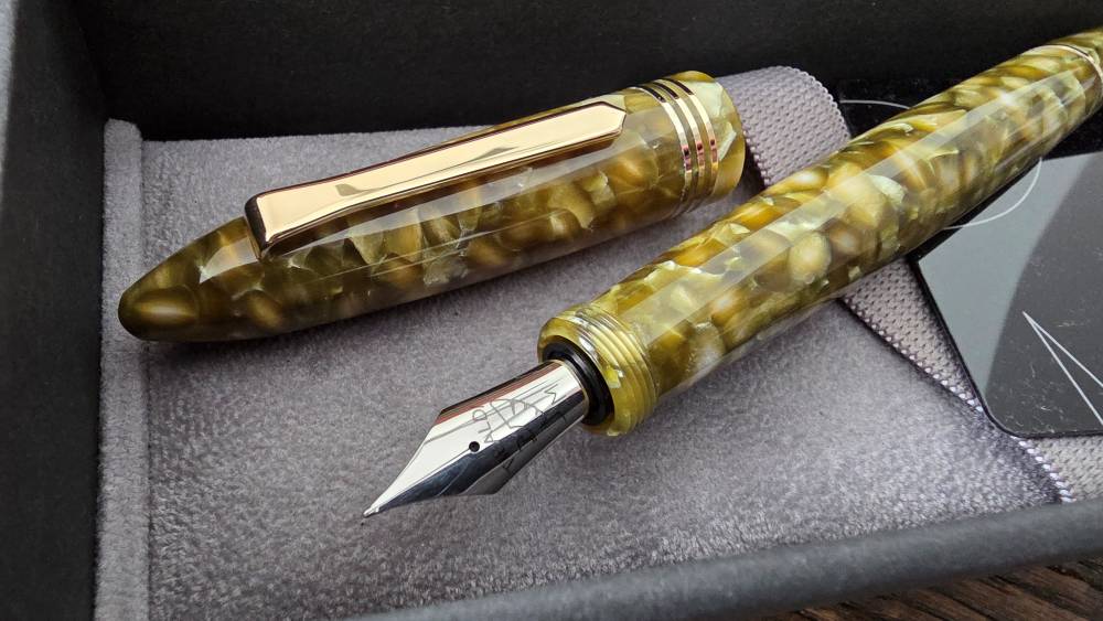 This limited edition vintage-inspired Tibaldi Bononia fountain pen features a flecked blue resin body and cap and pale yellow gold-plated trim.