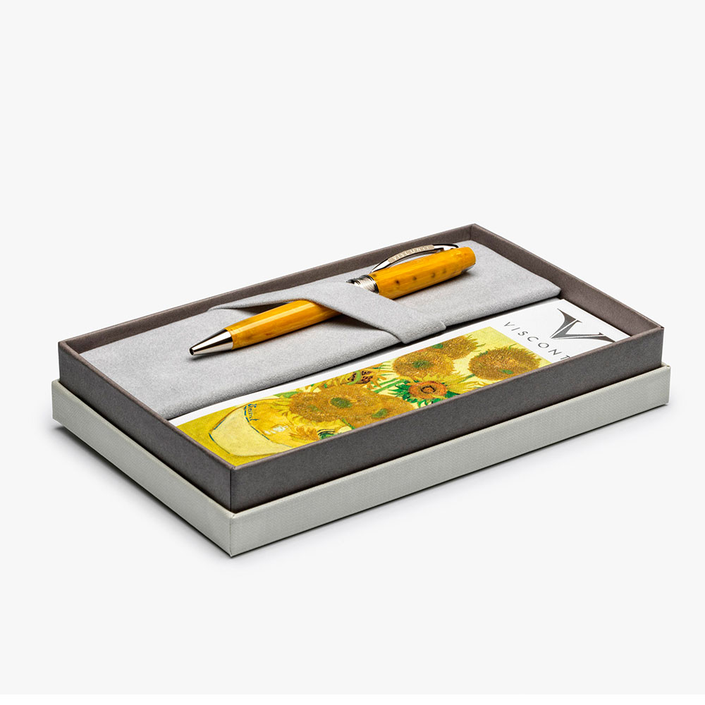 The Visconti ‘Sunflowers’ collection is made from natural resin, brought to life by vibrant yellow hues expressing a special significance for Van Gogh: ‘gratitude’. The meticulous selection of resins and their color mix is one of the major innovations introduced by Visconti and makes each and every Visconti Van Gogh pen unique. The colors are further enhanced by the unique 18 faceted design of the Van Gogh Collection. Available to order now in fountain pen, rollerball, and ballpoint, each pen is packaged in an exclusive gift box. Each fountain pen nib is made from steel and engraved with Van Gogh's signature