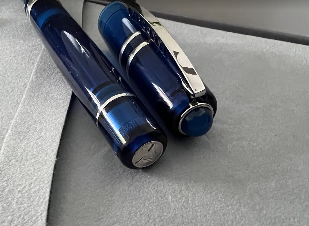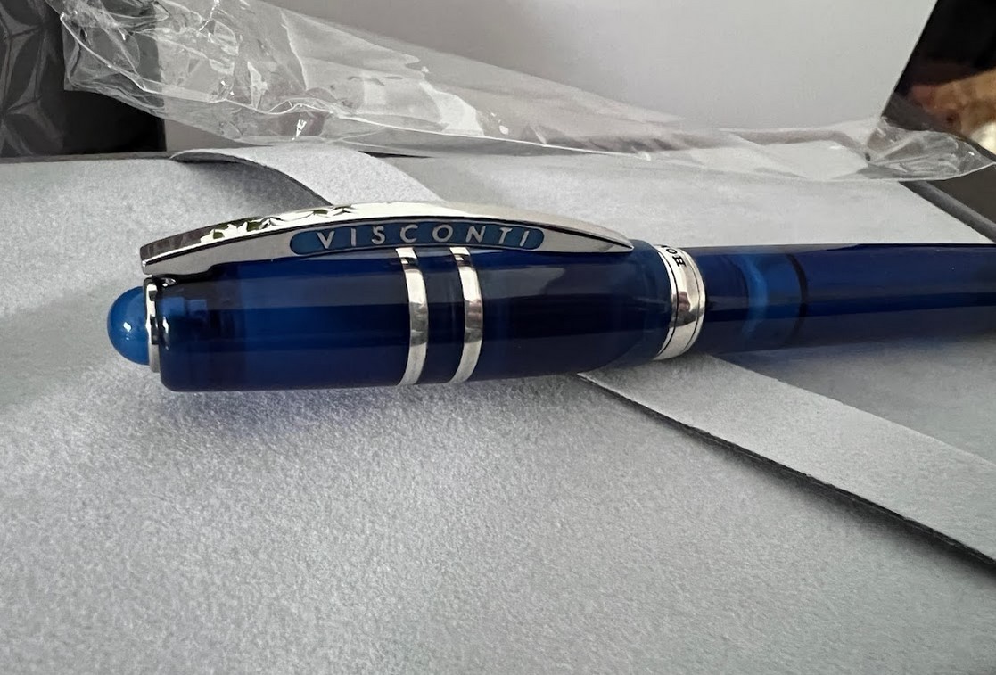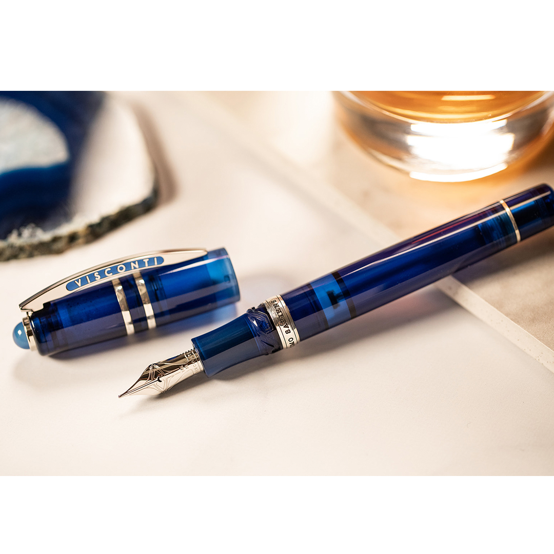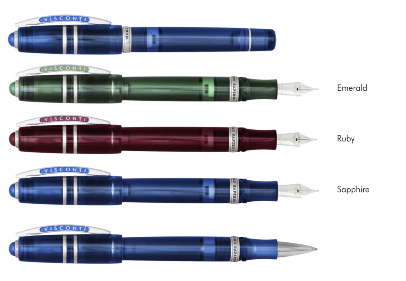 Three demonstrator colors were selected by Visconti, each inspired by the beauty of the most sought-after colored gemstones; Ruby, sapphire and emerald. Each pen is then enriched by a semi-precious stone in the top of the pen cap: green agate, blue agate, and red carnelian stones, to emulate the three inspirational gem colors of the pen bodies.