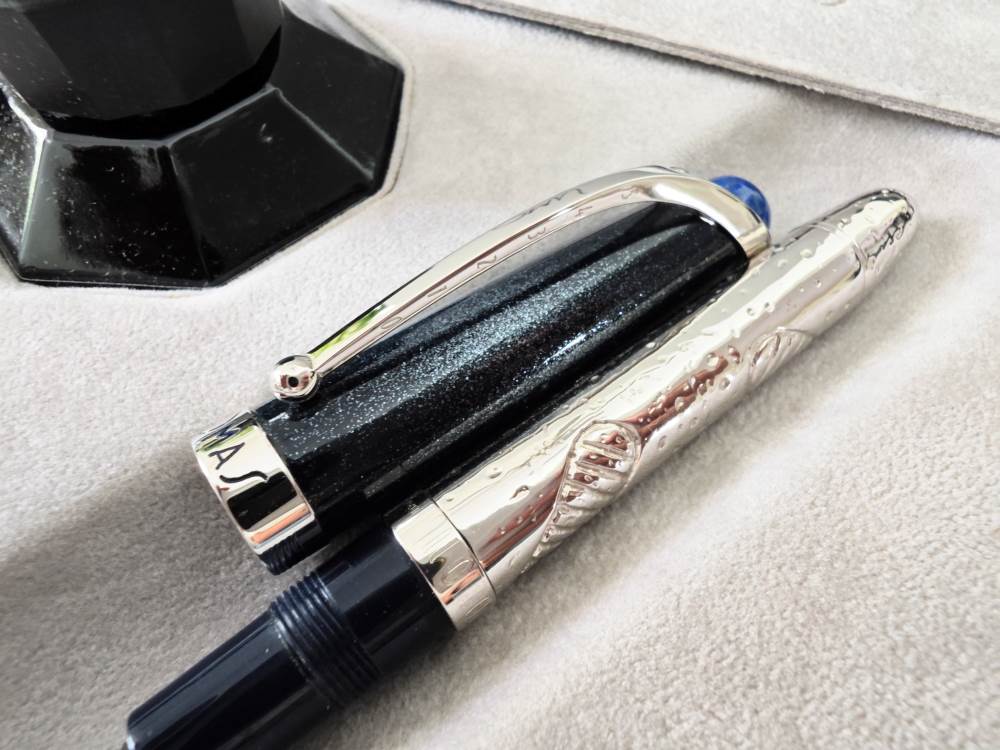 The design elements of this pen include that the pen barrel is the Moon. The clips resembles the flight pattern of Apollo 11 and is engraved with the countdown on the side of it. The precious lapis lazulis stone represents water which covers two thirds of earth which can be seen from the moon.