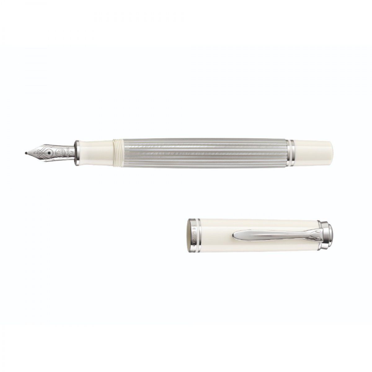As an extension of the standard collection, Pelikan launches the new series Souverän 405 silver-white. The bright but not cold silver and white colour shades underline the very distinctive interpretation of the true classic Souverän. The striped barrel is made of cellulose acetate. The characteristic double rings at the back of the barrel and on the cap are integrated into the material. This is done with the highest precision in order to obtain a virtual seamless transition between the materials. The completely rhodinized 14 carat gold nib matches the silver sheen of the other components. Even the silver-white barrel of the fountain pen and the upper-part of the ballpoint pen harmonize perfectly with the silver-white look