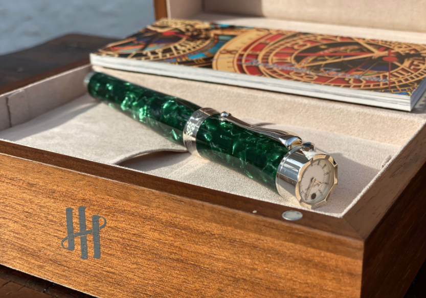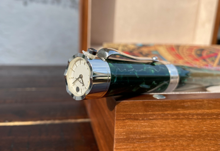 Concomitant with his stature, the pen collection dedicated to Bartolomeo Ferracina introduces a brand-new silhouette for a Montegrappa writing instrument. It is, appropriately, voluminous and as imposing as the immense tribute of Ferracina to the art of watch-making and to the science of engineering. Offered strictly as a fountain pen, the Ferracina limited edition exists in a total of 300 pens. It is produced in a series of only 100 pieces in each of three colours of pearlised celluloid: a rich Malachite Green, Shiny Circles made up of shades of grey and Indian Rainbow in beige hues, all with a sterling silver trim. Each pen is fitted with an 18k gold filigree-etched nib, available in the grades of Fine, Medium and Large. The nib’s filigree decoration is also found on the cap’s lower ring, which also hosts the Montegrappa logo. The signature clip with the traditional rotating sphere reflects the curves of the new body form. Aptly adorning the top of the cap is the perfect homage to Bartolomeo: it contains a functioning watch with a 16 mm. diameter, which is detachable from the cap top. It contains a MIYOTA slim quartz movement, its octogonal-shaped crown positioned directly above the pocket clip. Time-keeping, mechanical ingenuity and manufacture taking place entirely in Bassano del Grappa, all in one pen: there can be no better homage to Bartolomeo Ferracina.